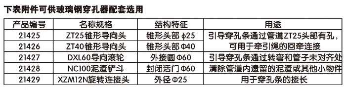 組成:玻璃鋼穿孔器由穿孔條和小車(chē)組成,穿孔條兩頭各有M12螺紋連接的尼龍導向頭和牽引環(huán),穿孔條的標準長(cháng)度為100m。